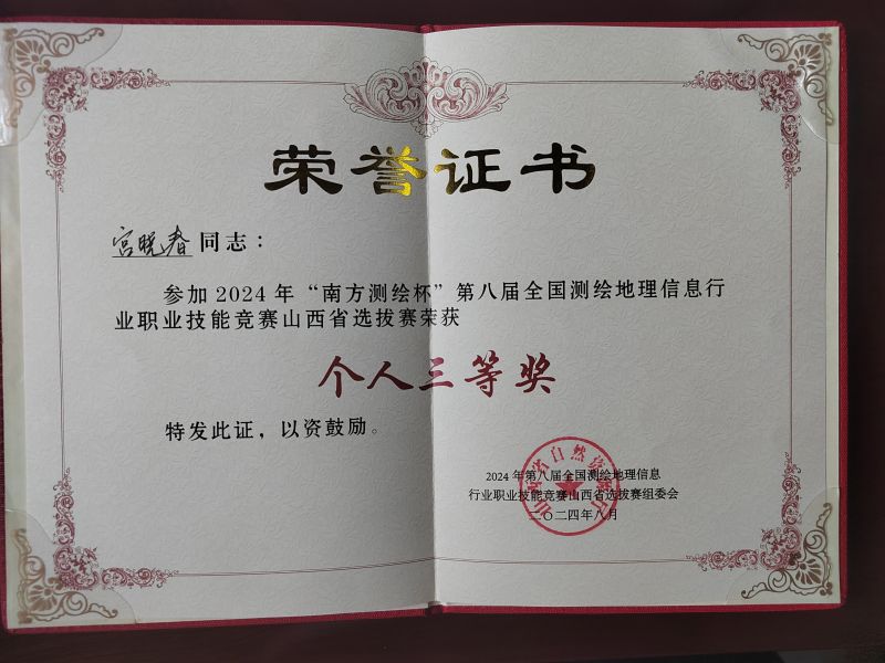 近日,由省自然资源厅、省人力资源和社会保障厅、省总工会联合举办的 2024 年“南方测绘杯”第八届全国测绘地理信息行业职业技能竞赛山西省选拔赛在晋中职业技术学院落幕。地勘院有限公司荣获团体优胜奖,两名职工获得个人三等奖。